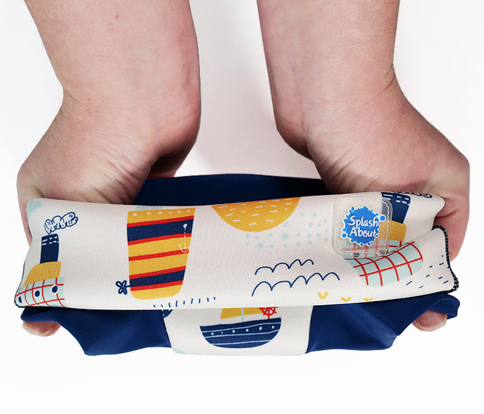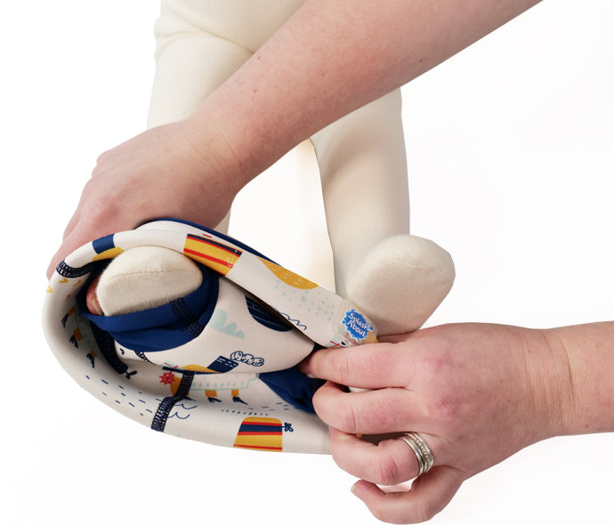 When the Happy Nappy™ is in place, you can then start to fit the top of the wetsuit. Roll it back up until you can comfortably insert baby’s arms, one at a time.
