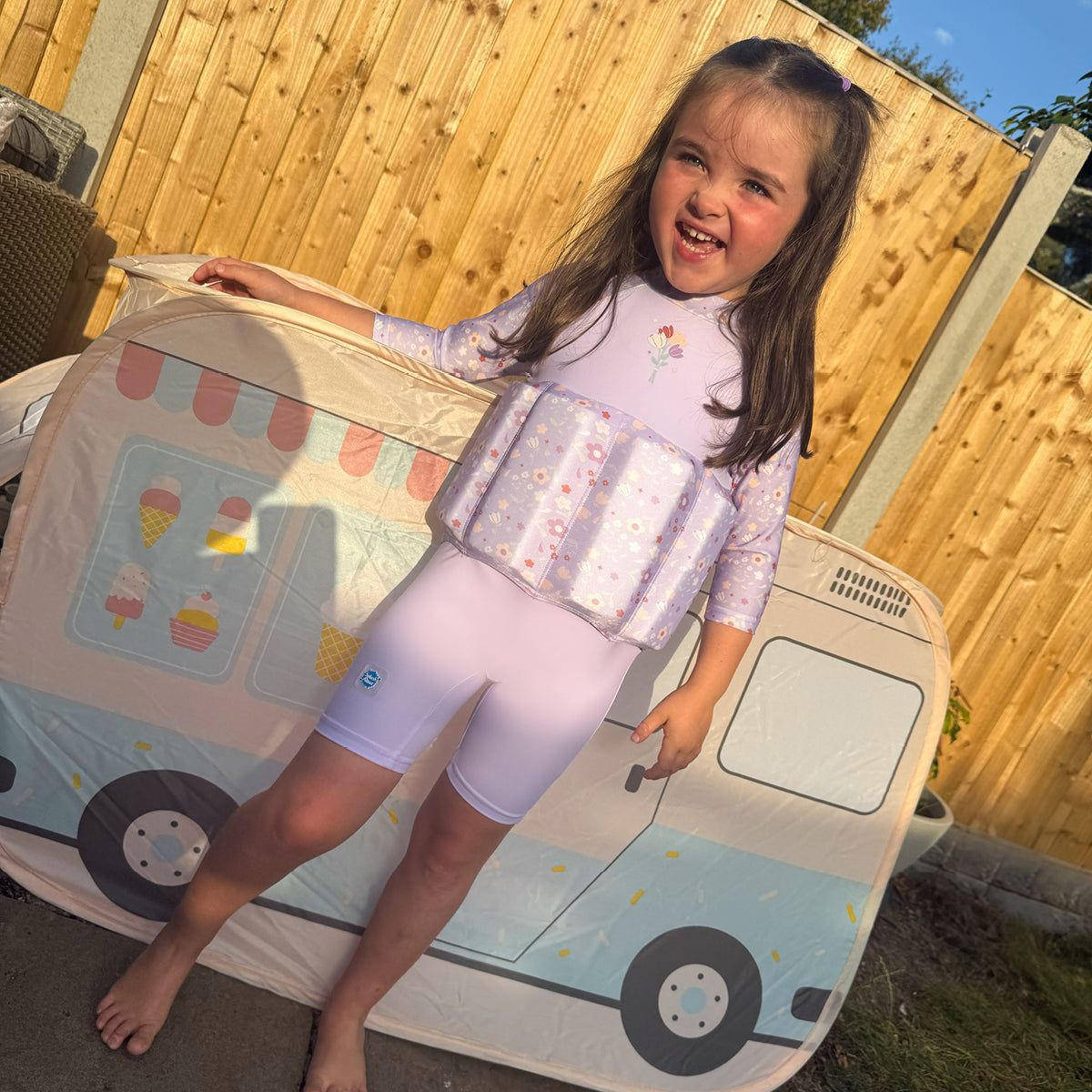 A Float Suit is a swimsuit with integrated float bars that can be removed as your child gains confidence in the water. It provides enough buoyancy to support children as they learn swimming strokes and helps position them correctly in the water when learning to swim.
